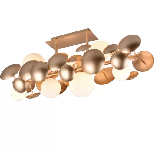 Prémium Trio mennyezeti lámpa arany színű fém vázzal, arany színű fém dekor elemekkel, fehér színű üveg búrával, 8db G9-es foglalattal.