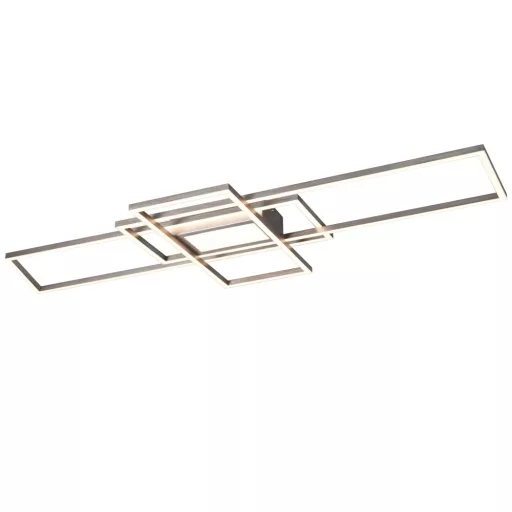 Matt nikkel színű fém mennyezeti lámpa műanyag betétes búrával, beépített LED fényforrással. A lámpához távirányító tartozik, mely segítségével állítható a LED fényereje, színhőmérséklete(3000-6500K).
