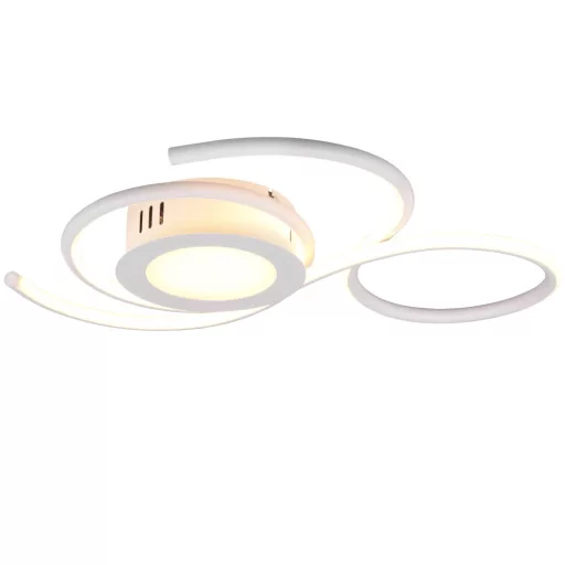 Matt fehér színű fém vázas mennyezeti lámpa fehér acryl betétes búrával, beépített LED fényforrással. A lámpához távirányító tartozik, mely segítségével állítható a LED fényereje, színhőmérséklete(2700-6000K) és színe.