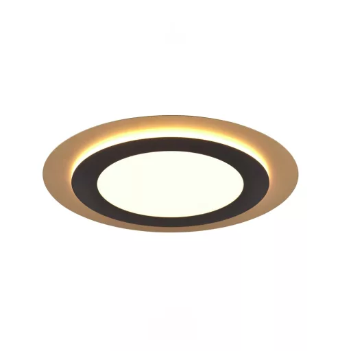 Fekete-arany színű fém vázas mennyezeti lámpa fekete-fehér színű fém és műanyag búrával, 2700-6500K közt állítható színhőmérsékletű beépített LED fényforrással. A lámpa egyéb funkciói: távirányítóval, fényerőszabályzós, színhőmérséklet szabályzóval, éjszakai fény funkcióval.