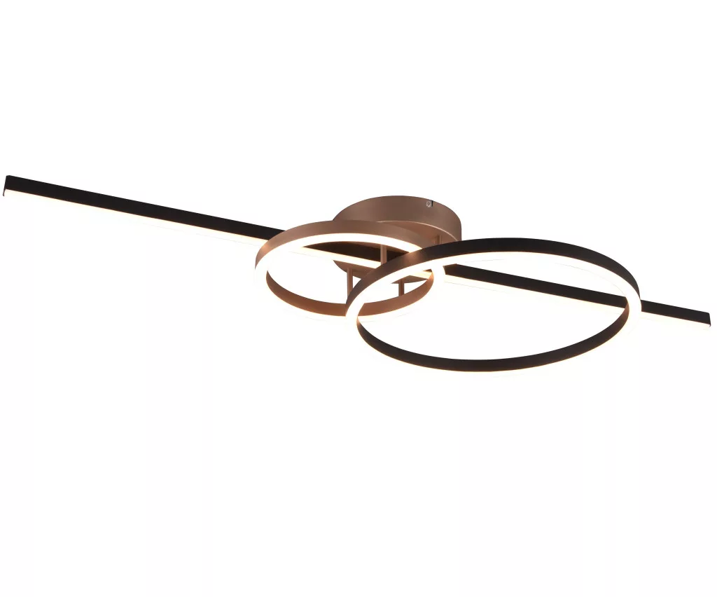 Kávé és fekete színű fém vázas mennyezeti lámpa fekete-fehér színű fém és műanyag búrával, 2700-6000K közt állítható színhőmérsékletű beépített LED fényforrással. A lámpa egyéb funkciói: távirányítóval, fényerőszabályzós, színhőmérséklet szabályzóval, éjszakai fény funkcióval.