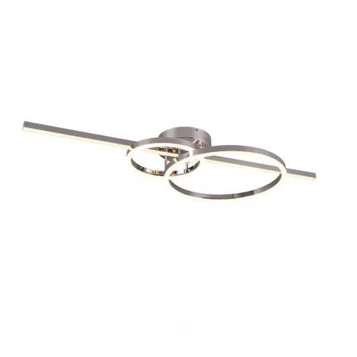 Króm színű fém vázas mennyezeti lámpa króm-fehér színű fém és műanyag búrával, 2700-6000K közt állítható színhőmérsékletű beépített LED fényforrással. A lámpa egyéb funkciói: távirányítóval, fényerőszabályzós, színhőmérséklet szabályzóval, éjszakai fény funkcióval.