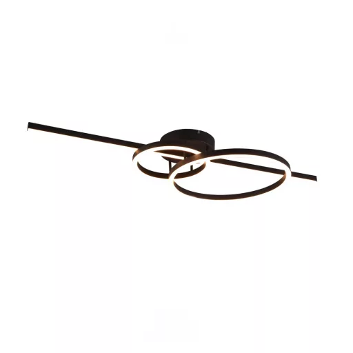 Fekete színű fém vázas mennyezeti lámpa fekete-fehér színű fém és műanyag búrával, 2700-6000K közt állítható színhőmérsékletű beépített LED fényforrással. A lámpa egyéb funkciói: távirányítóval, fényerőszabályzós, színhőmérséklet szabályzóval, éjszakai fény funkcióval.