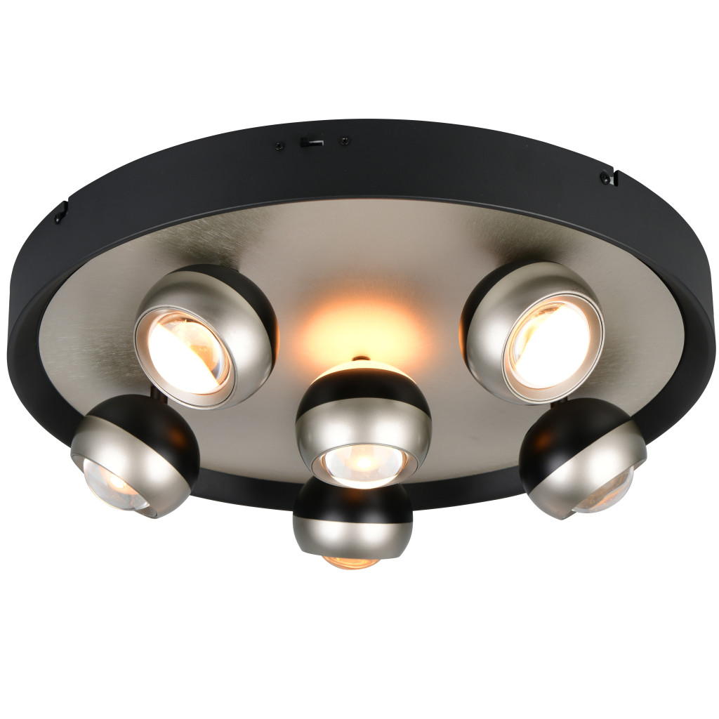 Fekete és nikkel színű fém mennyezeti lámpa 6db állítható fejjel, beépített LED fényforrással. A lámpafejek előre és hátra is világítanak. A lámpa színhőmérséklete a lámpán lévő kapcsoló segítségével állítható 2300/3000/4000Kelvinre azaz extra meleg/meleg/természetes fehér színre. A lámpa fényereje fali kapcsoló segítségével több lépcsőben szabályozható (25-50-100%).