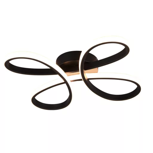 Fekete színű fém vázas mennyezeti lámpa különleges formájú acryl betétes búrával, meleg fehér színhőmérsékletű beépített LED fényforrással. A lámpa fényereje fali kapcsoló fel/le kapcsolásával 25-50-100% között állítható.