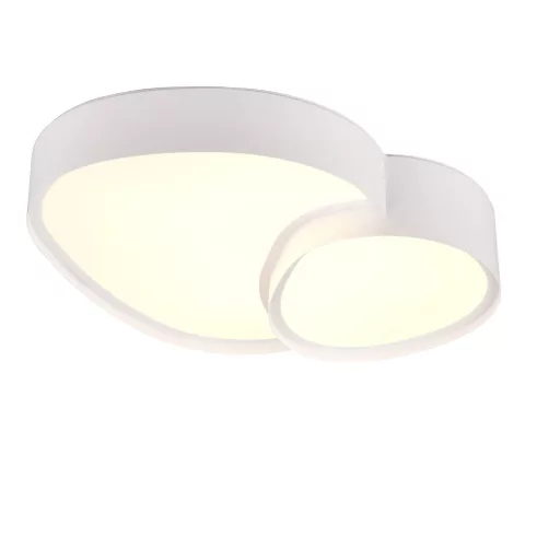 Fehér színű fém vázas mennyezeti lámpa fehér színű műanyag búrával, beépített LED fényforrással. A lámpát távirányítóval szállítjuk, mely segítségével állítható a LED színhőmérséklete (2700-6500K, meleg-hideg) és fényereje.
