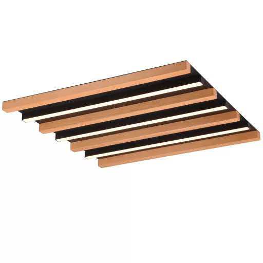 46cm hosszú, 46cm széles, fekete színű fém vázas mennyezeti lámpa fa és fehér műanyag betéttel, meleg fehér színhőmérsékletű beépített LED fényforrással. A lámpa fényereje fali kapcsoló segítségével több lépcsőben szabályozható (25-50-100%).