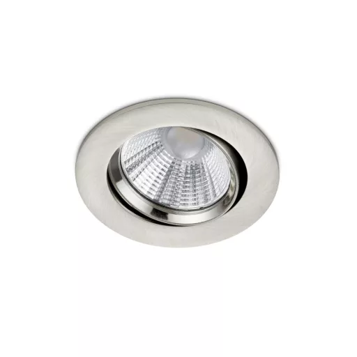 Matt nikkel színű fém billenthető mennyezetbe építhető lámpa beépített, fényerőszabályozható meleg fehér színhőmérsékletű LED fényforrással IP23-as védelemmel.
