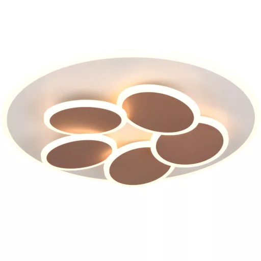 Rendkívül dekoratív fém mennyezeti lámpa világos szürke és kávé színekkel, beépített LED fényforrással. A lámpához távirányító tartozik, mely segítségével állítható a LED fényereje, színhőmérséklete(2700-6500K, melegtől a hideg fehérig), illetve a lámpa memória, időzítő és éjszakai fény funkcióval is rendelkezik.
