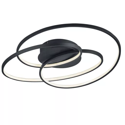 Matt fekete színű fém mennyezeti lámpa műanyag betétes búrával, beépített meleg fehér színhőmérsékletű LED fényforrással. A lámpa fényereje fali kapcsoló segítségével több lépcsőben(25,50,100%) kapcsolható.