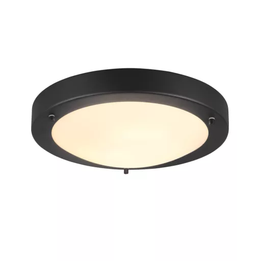 Matt fekete színű fém vázas fürdőszobai mennyezeti lámpa opálos üveg búrával, 1db E27-es foglalattal, IP44-es védelemmel.
