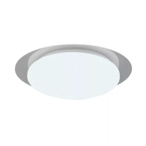 Matt fehér színű, átlátszó peremes műanyag fürdőszobai mennyezeti lámpa csillagos égbolt effektes búrával, természetes fehér színhőmérsékletű beépített LED fényforrással, IP44-es védelemmel. A lámpához távirányító tartozik, mely segítségével állítható a LED fényereje, színe.