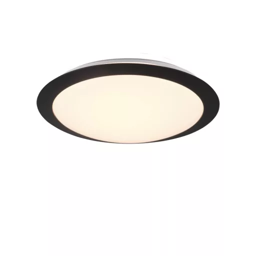 Matt fehér színű, fekete keretes műanyag fürdőszobai mennyezetii lámpa meleg fehér színhőmérsékletű beépített LED fényforrással, IP44-es védelemmel.