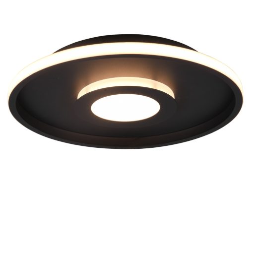 Matt fekete színű fém fürdőszobai mennyezeti lámpa acryl betéttel, meleg fehér színhőmérsékletű beépített LED fényforrással, IP44-es védelemmel. A lámpa fényereje fali kapcsoló segítségével több lépcsőben(25,50,100%) kapcsolható.