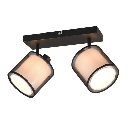 Fekete színű fém vázas spot lámpa fekete-fehér színű textil búrával, E14-es foglalattal. A lámpa egyéb jellemzői: állítható fejű lámpa. A lámpa búrája dupla, kívül fekete áttetsző organza, belül pegid fehér textil lámpa ernyő.
