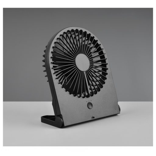Fekete színű műanyag akkumulátoros ventilátor. A ventilátor talpa segítségével asztalra rakható. A ventilátor forgási sebessége 3 fokozatban állítható.