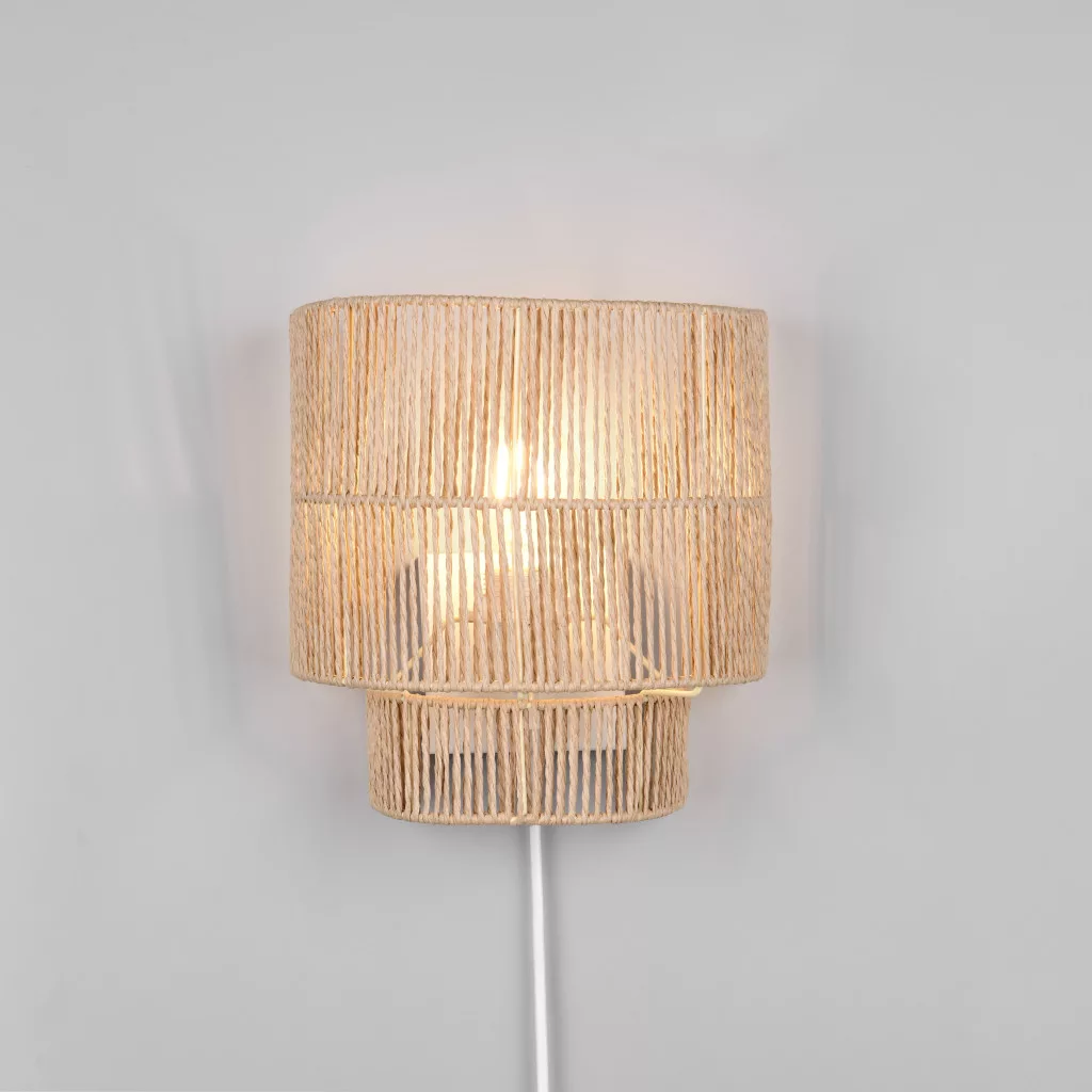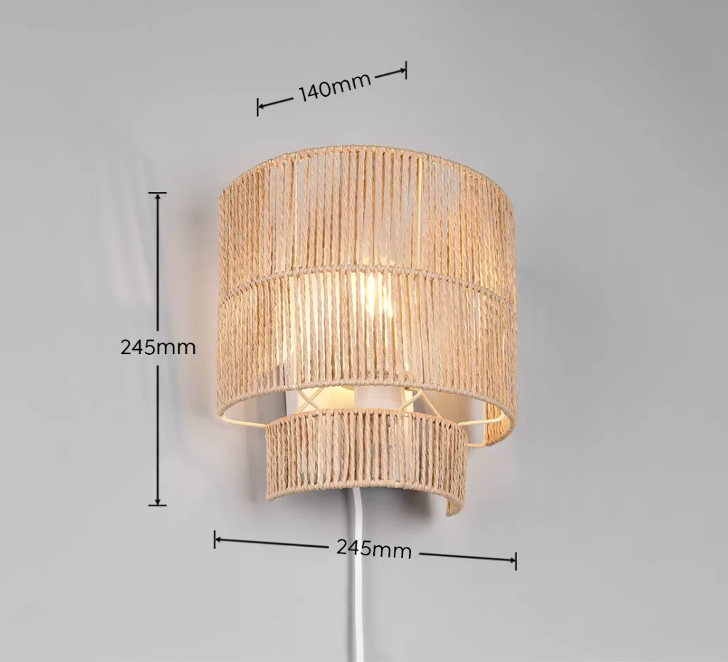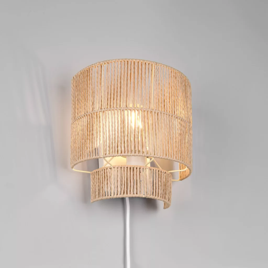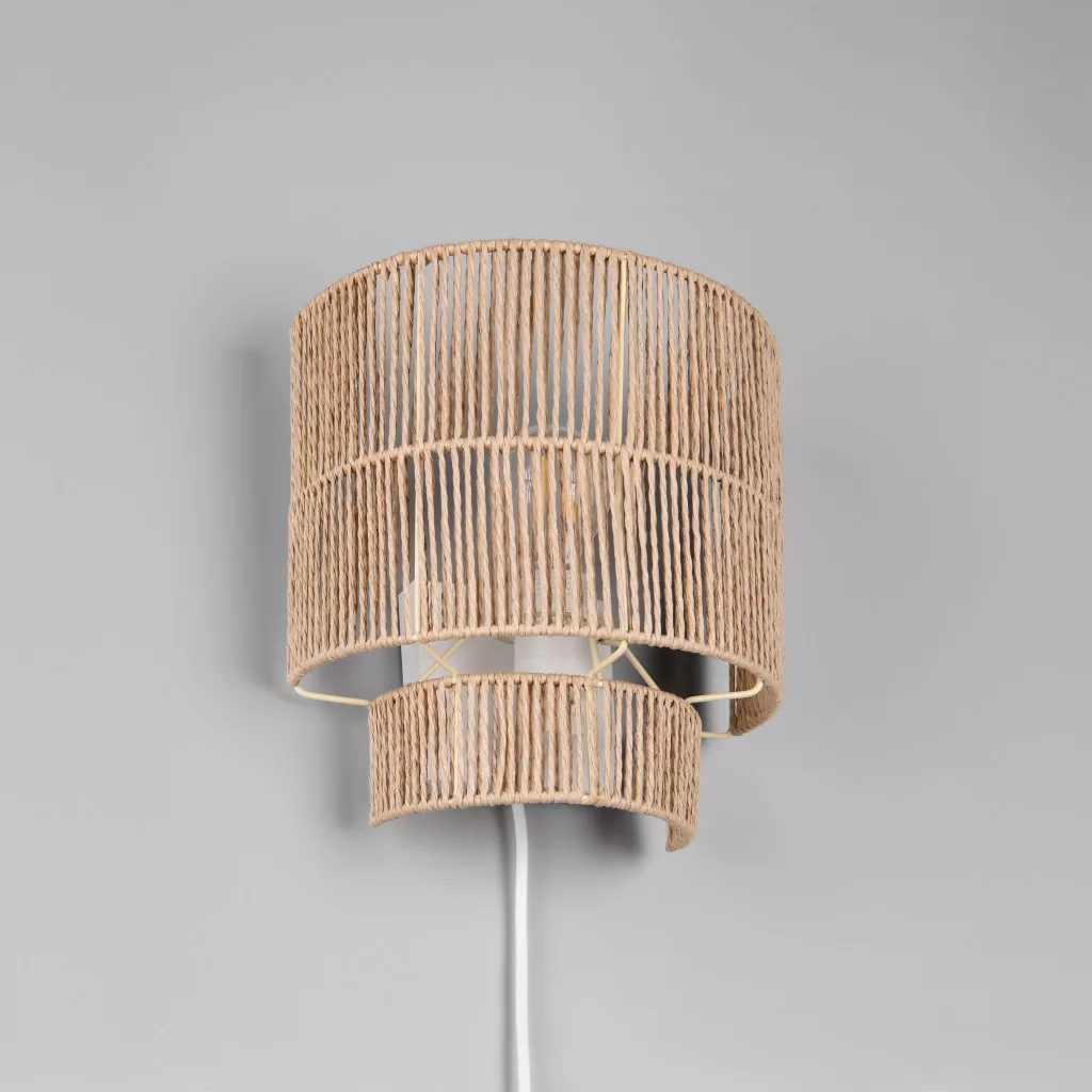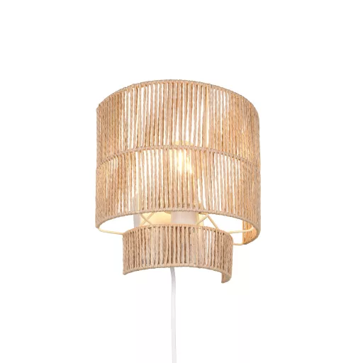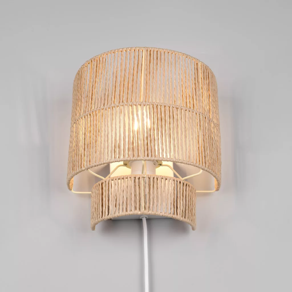 Fehér színű fém vázas fali lámpa sodort papír fonal búrával, E27-es foglalattal. A fali lámpa alkalmas fix csatlakoztatásra vagy dugaszolható vezetékkel történő működtetésre is.