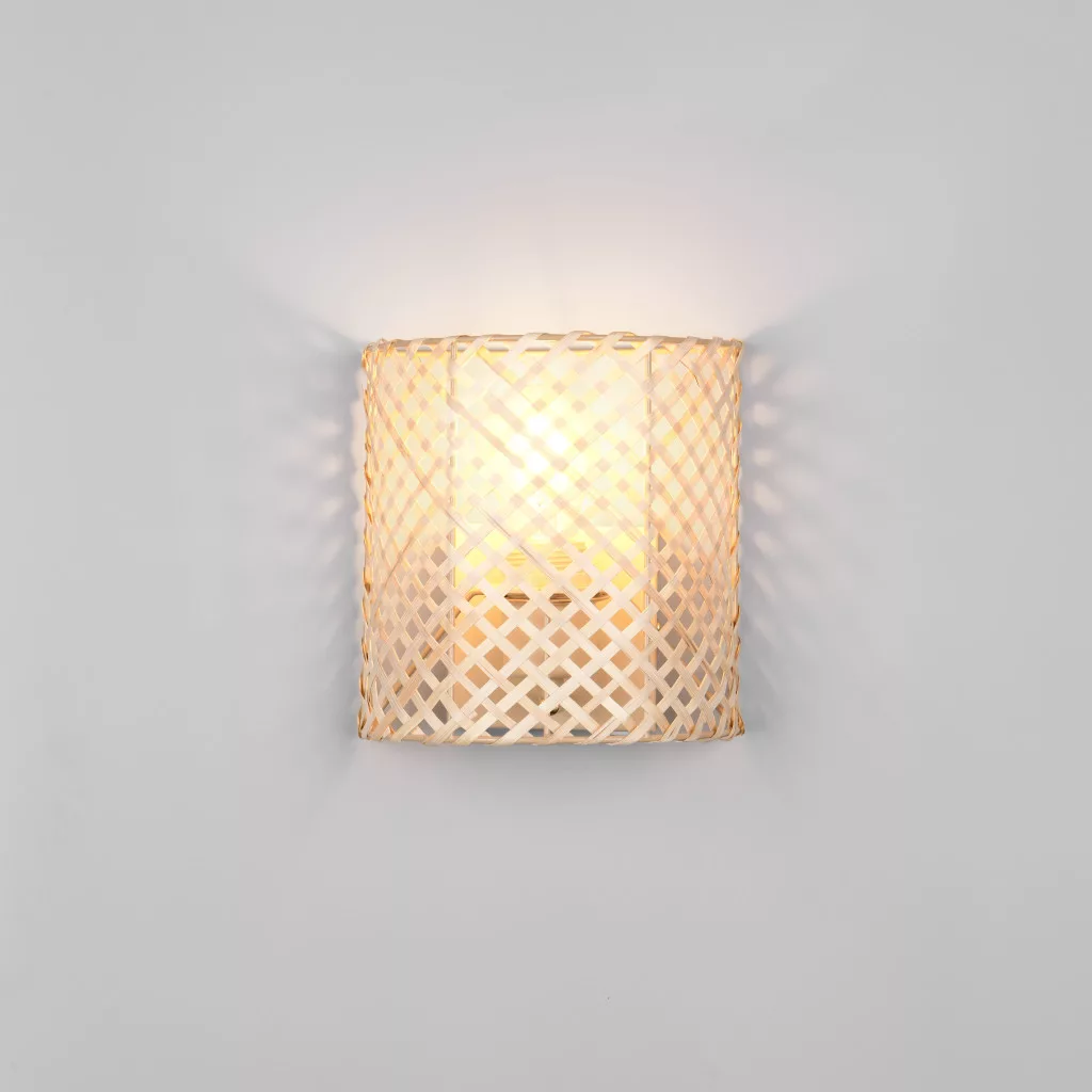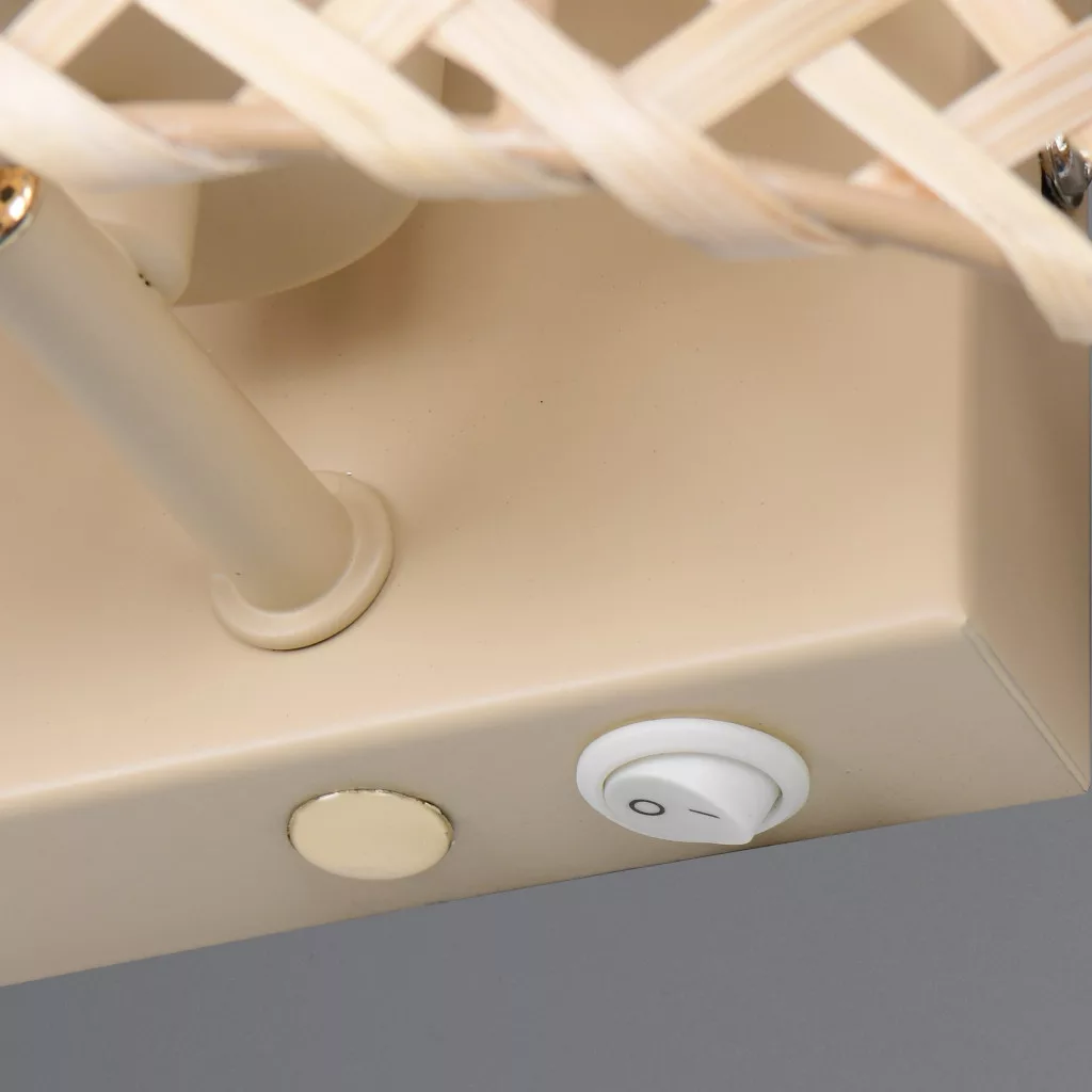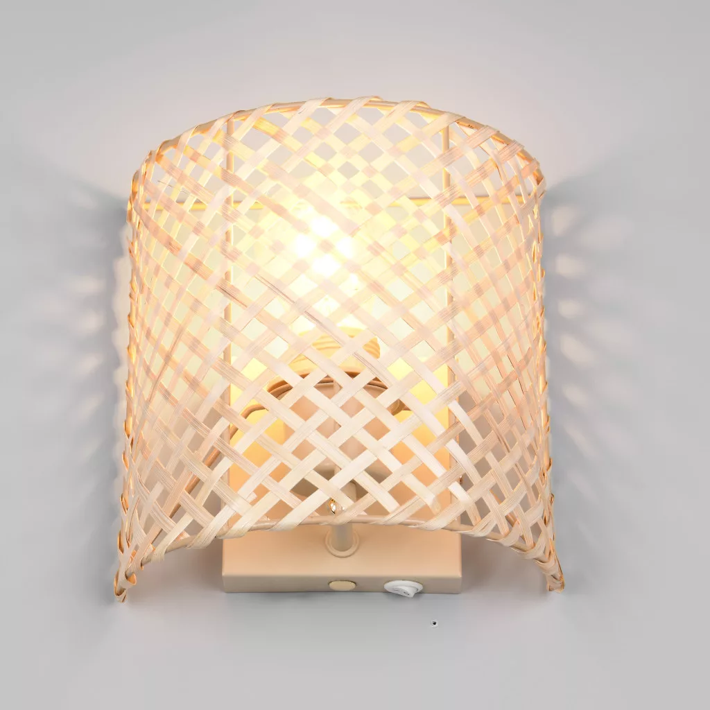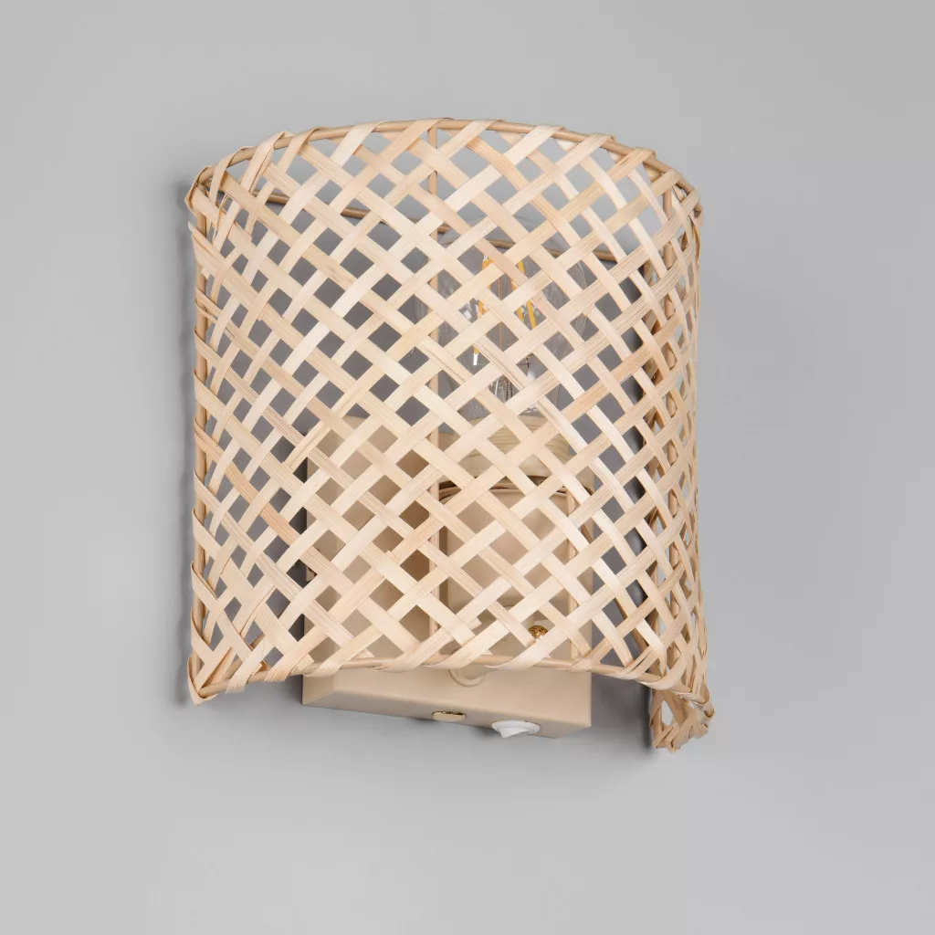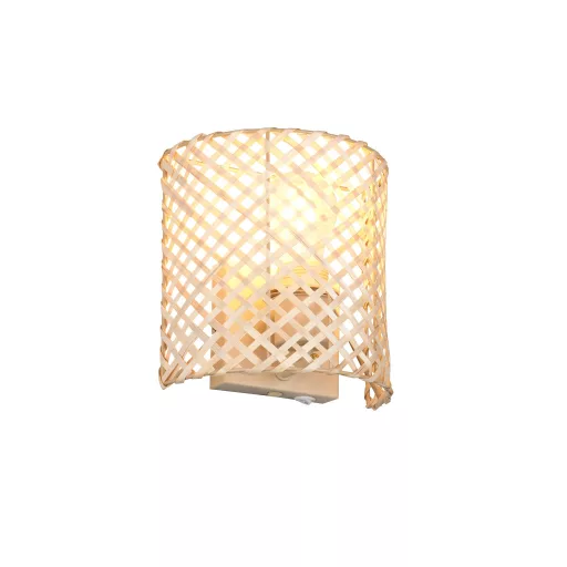Bézs színű fém vázas fali lámpa natúr bambusz búrával, E27-es foglalattal, a fali elemen található kapcsolóval. A fali lámpa alkalmas fix csatlakoztatásra vagy dugaszolható vezetékkel történő működtetésre is.