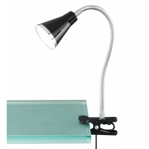 Fekete és króm színű műanyag csiptetős lámpa beépített meleg fehér színhőmérsékletű LED fényforrással, flexibilis karral, vezetékre szerelt kapcsolóval.