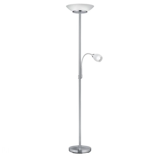 Matt nikkel színű fém olvasókaros álló lámpa fehér színű üveg búrával, a fő világításban 2db E27-es az olvasókarban 1db E14-es foglalattal. A lámpatestn két kapcsolóval a fő lámpa és az olvasókar egyedi kapcsolására.