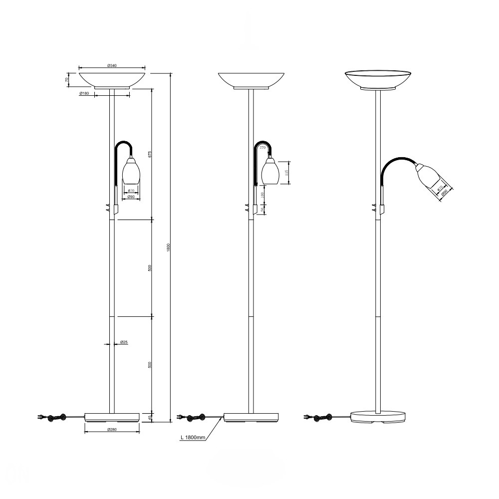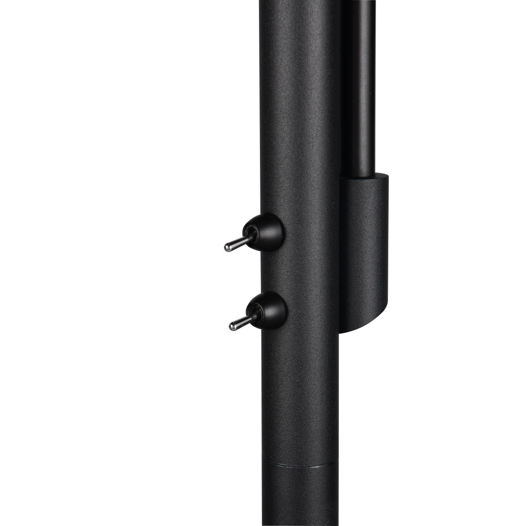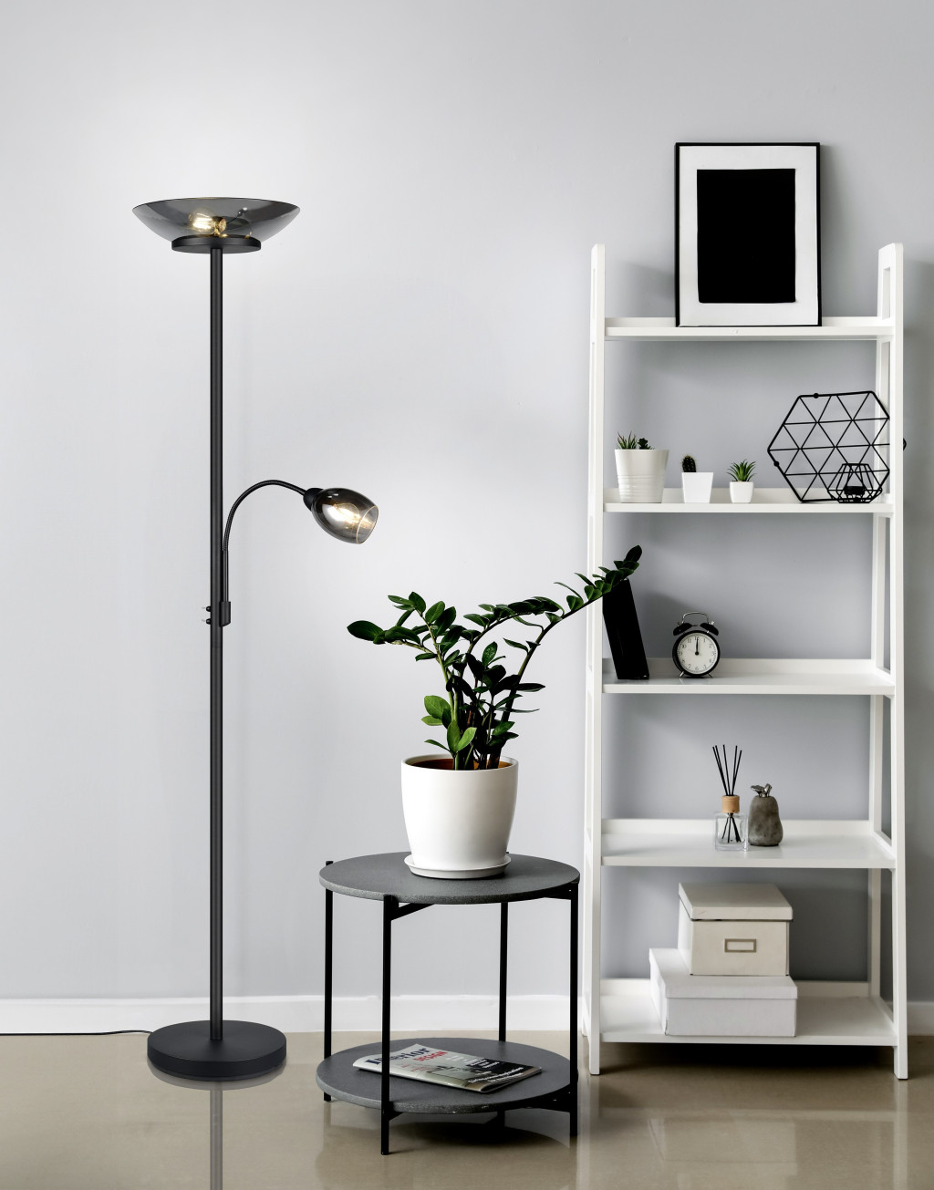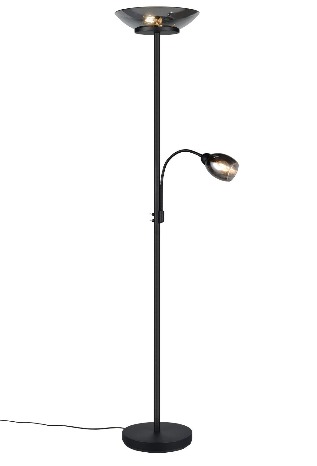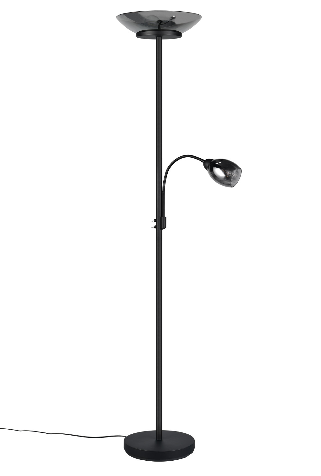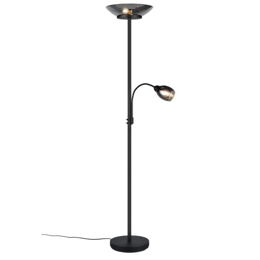 Matt fekete színű fém vázas olvasókaros álló lámpa krómozott füstszínű üveg búrával, flexibilis olvasókarral. A lámpatesten található kapcsolók segítségével külön kapcsolható a felső búrában található 2db E27-es foglalat illetve az olvasókarban található 1db E14-es foglalat.