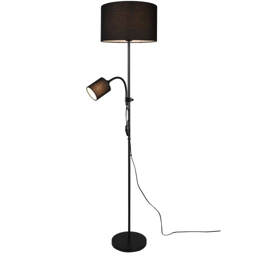 Matt fekete színű fém olvasókaros álló lámpa fekete színű textil búrával, a fő világításban 1db E27-es az olvasókarban 1db E14-es foglalattal, vezetékre szerelt kapcsolóval a fő lámpa és az olvasókar egyedi kapcsolására.