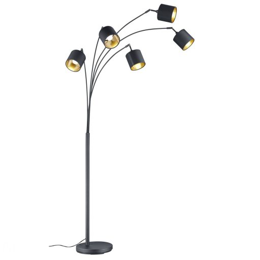 Matt fekete színű fém vázas álló lámpa kívül fekete, belül arany színű textil lámpaernyővel, E14-es foglalattal, taposó kapcsolóval.