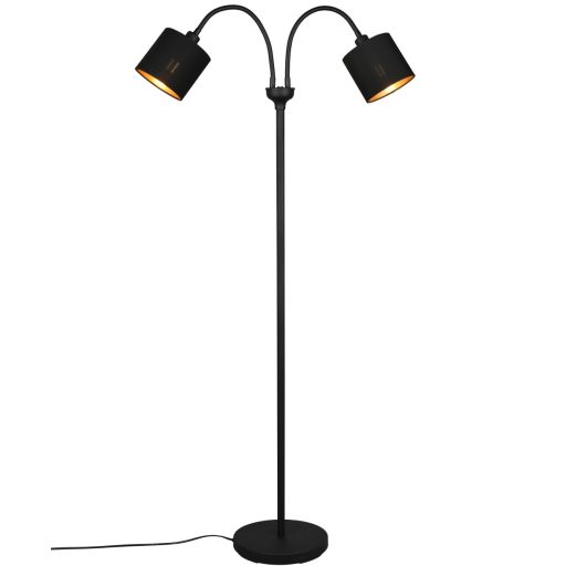Matt fekete színű fém vázas álló lámpa kívül fekete, belül arany színű textil lámpaernyővel, flexibilis karral, E14-es foglalattal, lámpatesten elhelyezett kapcsolóval.