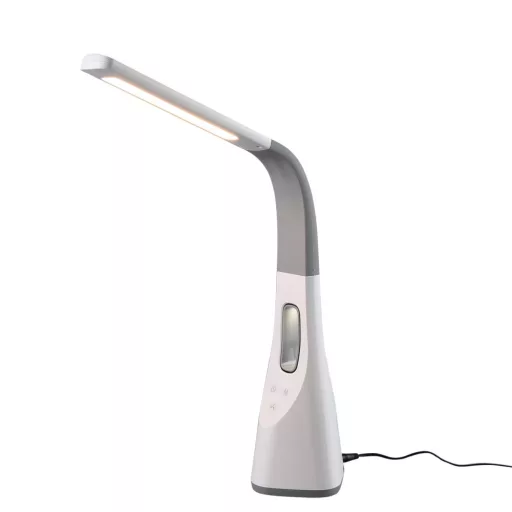 Fehér színű műanyag íróasztali lámpa flexibilis karral, beépített LED fényforrással, beépített ventilátorral. A lámpa fényereje és színhőmérséklete illetve a ventilátor intenzitása 3 lépcsőben szabályozható.