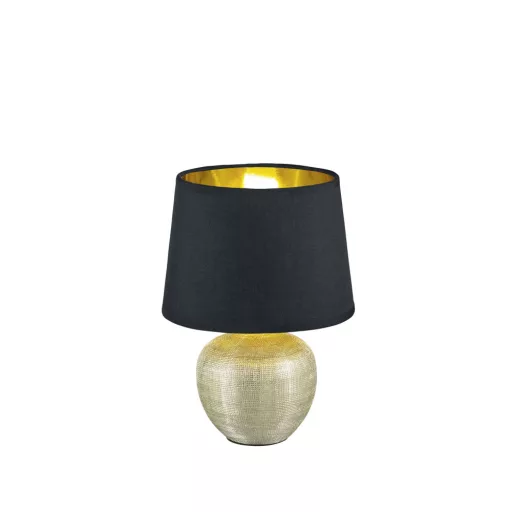 Arany színű kerámia vázas asztali lámpa fekete színű textil bevonatos lámpaernyővel, 1db E14-es foglalattal, vezetékre szerelt kapcsolóval.