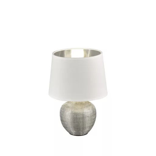Ezüst színű kerámia vázas asztali lámpa fehér színű textil bevonatos lámpaernyővel, 1db E14-es foglalattal, vezetékre szerelt kapcsolóval.