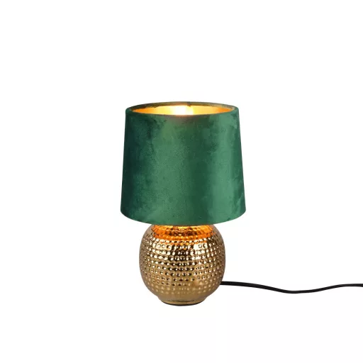Arany színű kerámia lábas asztali lámpa zöld bársony színű lámpaernyővel, E14-es foglalattal, vezetékre szerelt kapcsolóval.