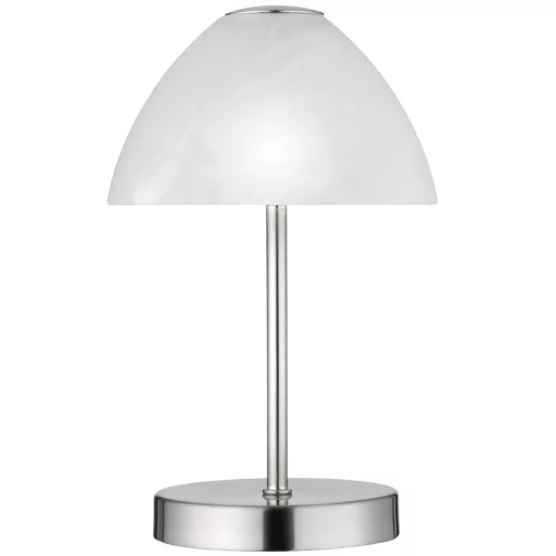 Matt nikkel színű fém lábas, alabástrom üveg búrás meleg fehér színhőmérsékletű, érintéssel fényerőszabályozható beépített LED fényforrással.