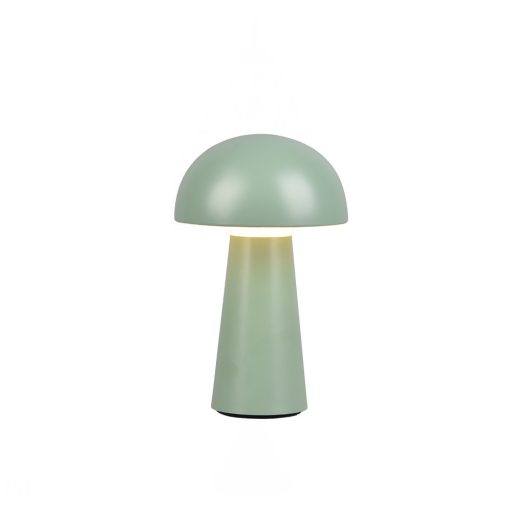Pisztácia zöld színű akkumulátoros műanyag kültéri asztali lámpa beépített meleg fehér színhőmérsékletű LED fényforrással, IP44-es védelemmel. A lámpa fényereje érnitéssel 3 lépcsőben szabályozható. Illetve az akkumulátor USB porton keresztül tölthető.