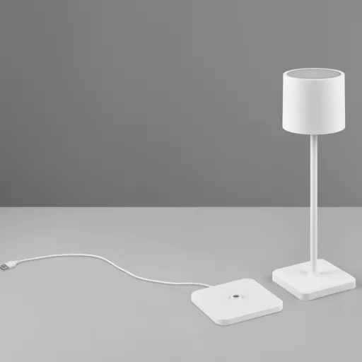 Fehér színű fém vázas akkumulátoros asztali lámpa fehér műanyag betétes búrával, beépített LED fényforrással.A LED fényereje és színhőmérséklete (2700, 4000, 6000K) érintéssel állítható. A lámpa tartozék USB-s töltő állomáson tölthető. Töltési idő kb. 4 óra, amivel a lámpa akár 8 órán keresztül üzemel. A lámpa IP54-es védelemmel rendelkezik, így kültéren és beltéren egyaránt használható.