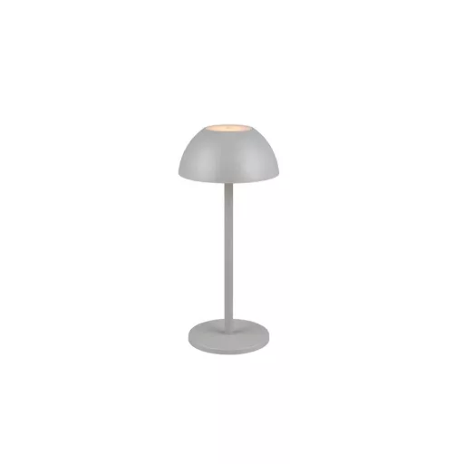 Közép szürke színű műanyag akkumulátoros asztali lámpa műanyag búrával, felfelé és lefelé egyaránt világító meleg fehér színhőmérsékletű beépített LED fényforrással. A LED fényereje 3 lépcsőben érintéssel állítható. A lámpafejen lévő USB C kábelen keresztül tölthető. Töltési idő kb. 4 óra, amivel a lámpa akár 4 órán keresztül üzemel. A lámpa IP54-es védelemmel rendelkezik, így kültéren és beltéren egyaránt használható.