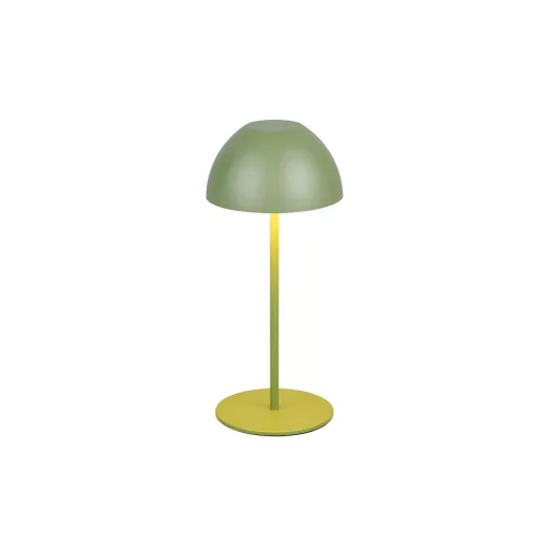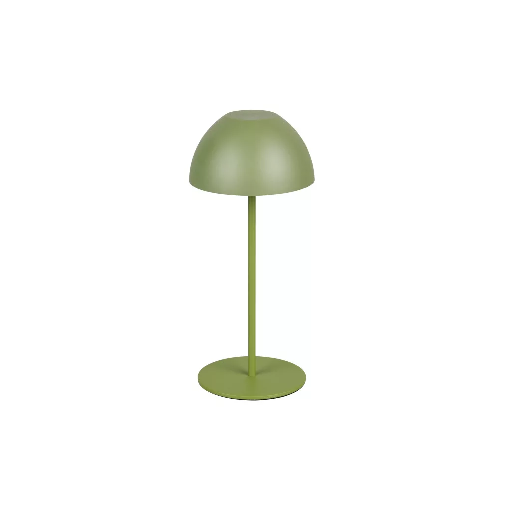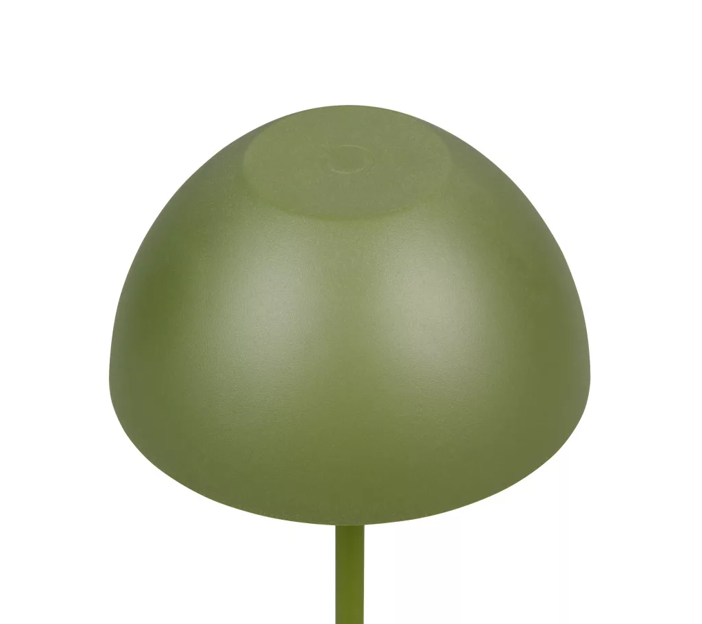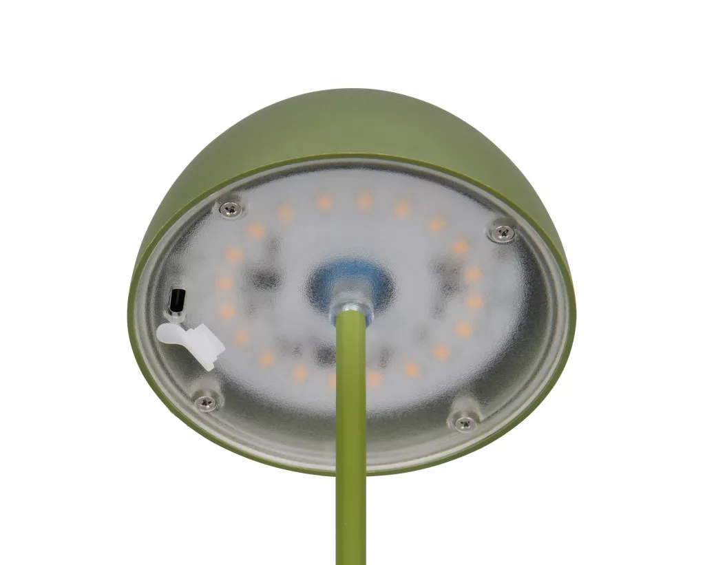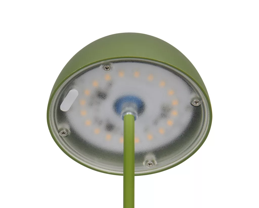 Zöld színű műanyag akkumulátoros asztali lámpa műanyag betéts búrával, felfelé és lefelé egyaránt világító meleg fehér színhőmérsékletű beépített LED fényforrással. A LED fényereje 3 lépcsőben érintéssel állítható. A lámpafejen lévő USB kimeneten keresztül tölthető. Töltési idő kb. 2 óra, amivel a lámpa akár 3 órán keresztül üzemel. A lámpa IP44-es védelemmel rendelkezik, így kültéren és beltéren egyaránt használható.