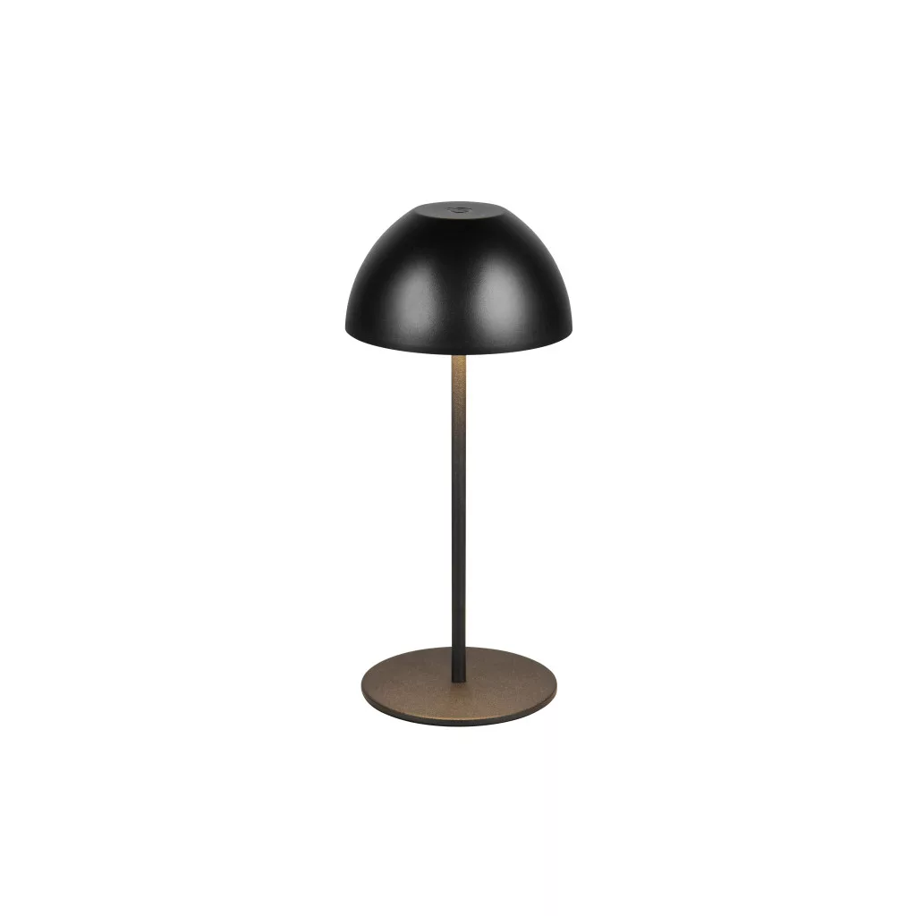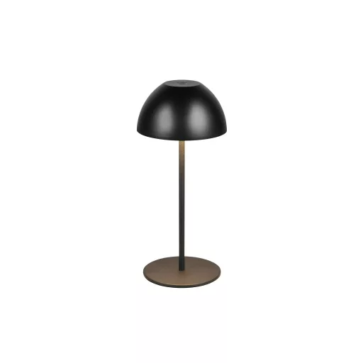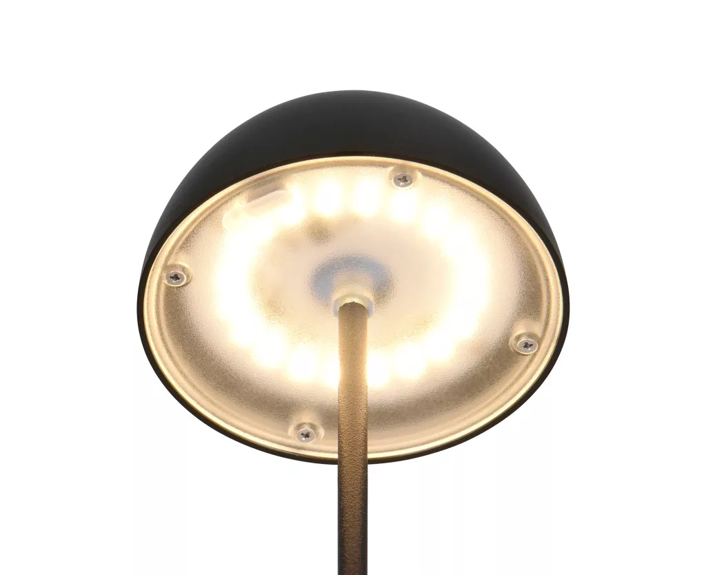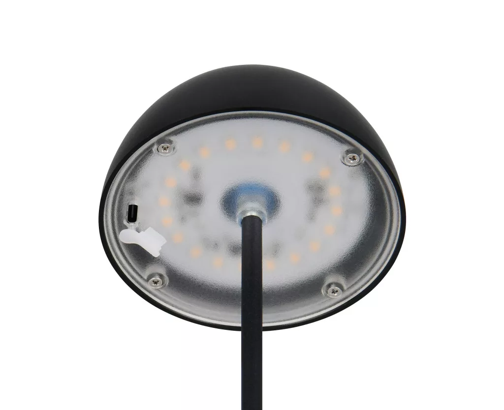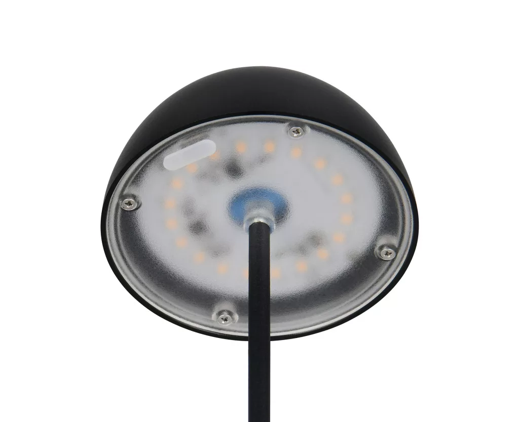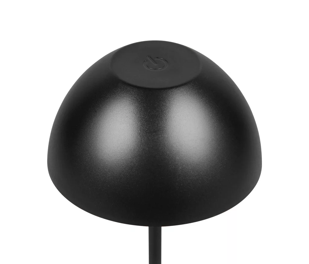 Matt fekete színű műanyag akkumulátoros asztali lámpa műanyag betéts búrával, felfelé és lefelé egyaránt világító meleg fehér színhőmérsékletű beépített LED fényforrással. A LED fényereje 3 lépcsőben érintéssel állítható. A lámpafejen lévő USB kimeneten keresztül tölthető. Töltési idő kb. 2 óra, amivel a lámpa akár 3 órán keresztül üzemel. A lámpa IP44-es védelemmel rendelkezik, így kültéren és beltéren egyaránt használható.