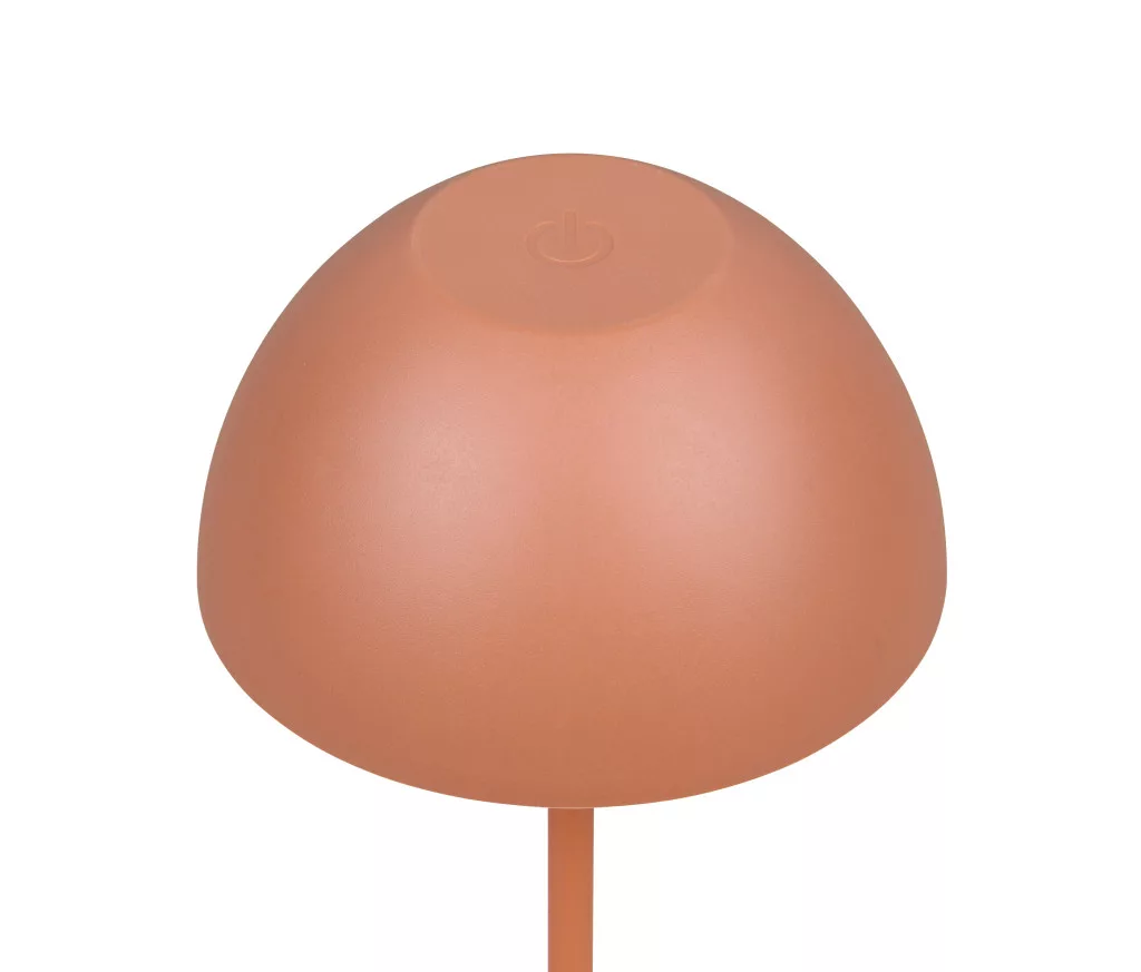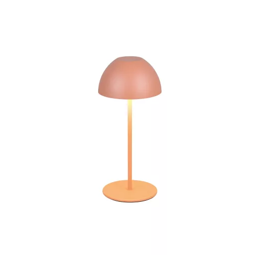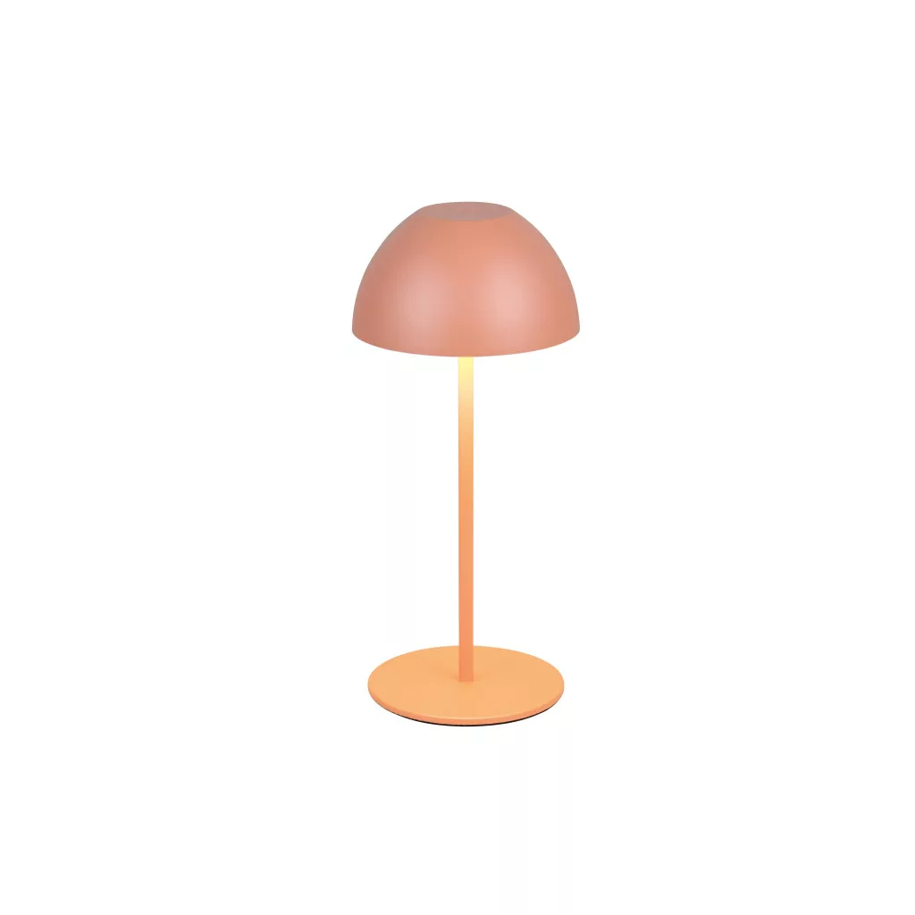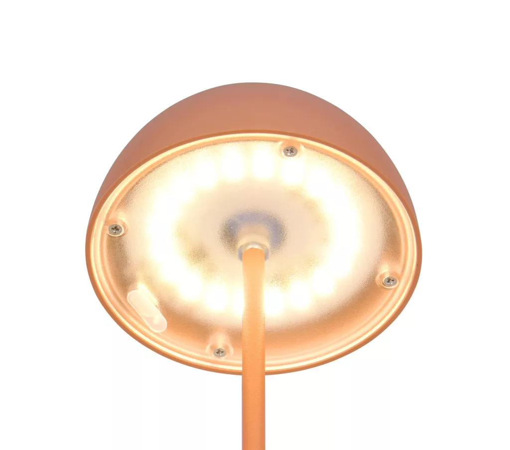 Barack színű műanyag akkumulátoros asztali lámpa műanyag betéts búrával, felfelé és lefelé egyaránt világító meleg fehér színhőmérsékletű beépített LED fényforrással. A LED fényereje 3 lépcsőben érintéssel állítható. A lámpafejen lévő USB kimeneten keresztül tölthető. Töltési idő kb. 2 óra, amivel a lámpa akár 3 órán keresztül üzemel. A lámpa IP44-es védelemmel rendelkezik, így kültéren és beltéren egyaránt használható.