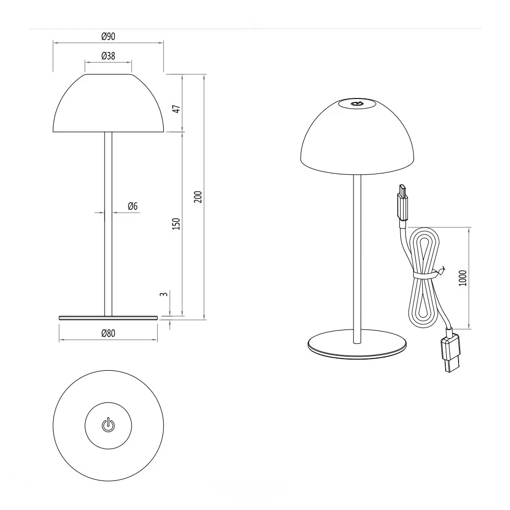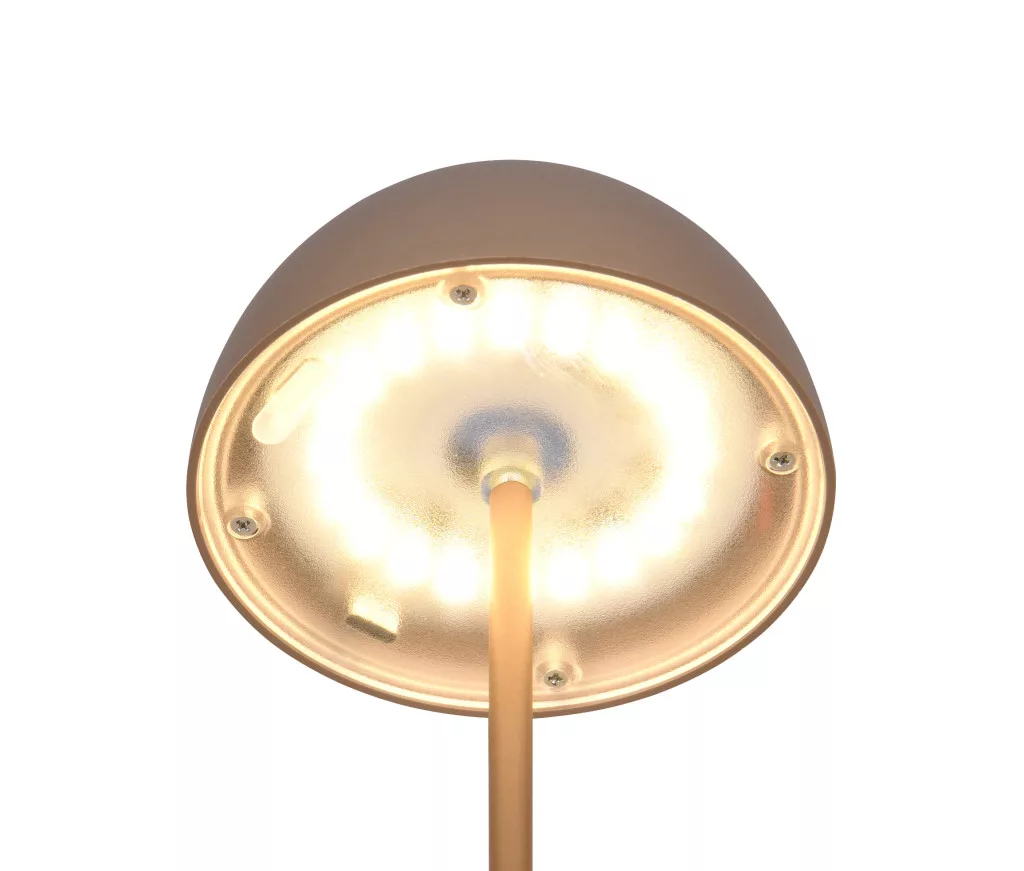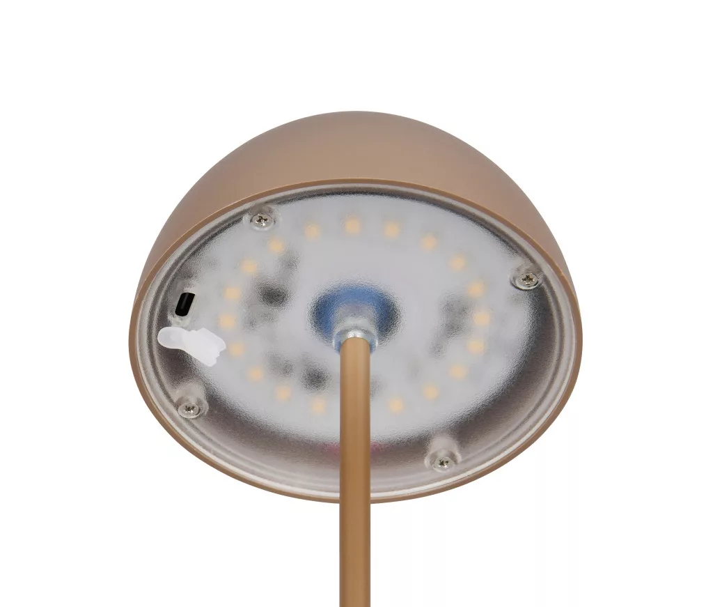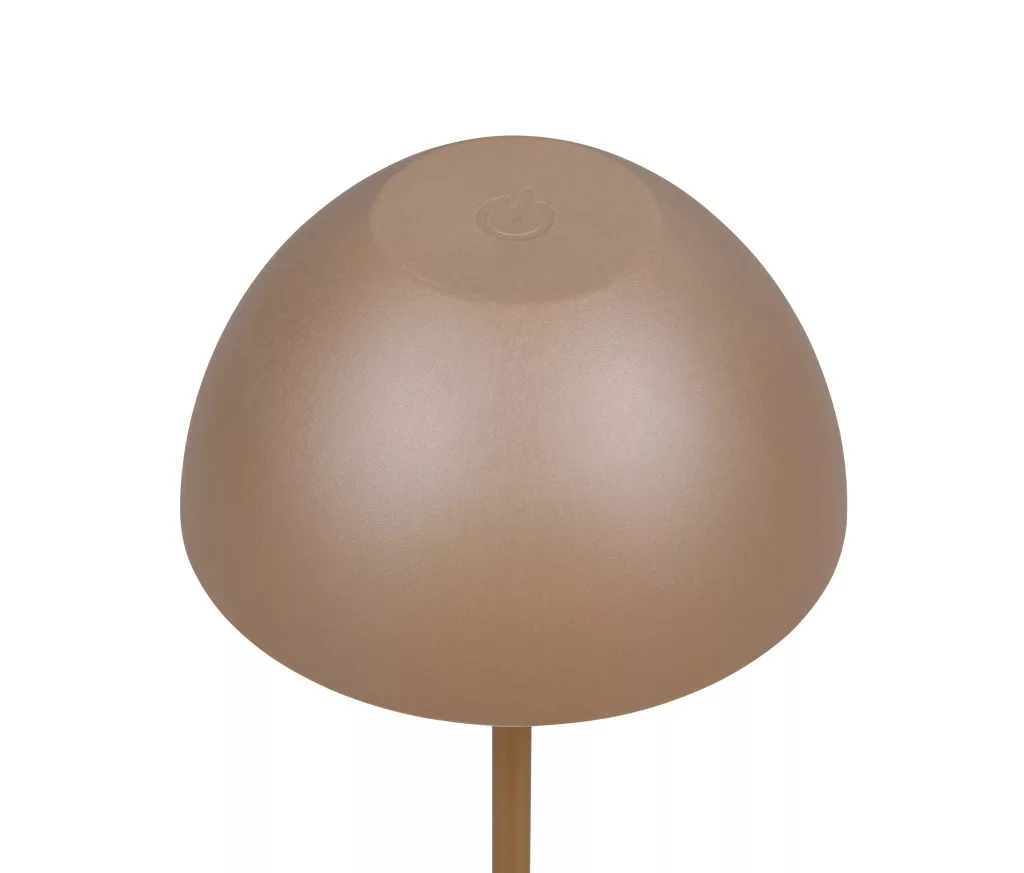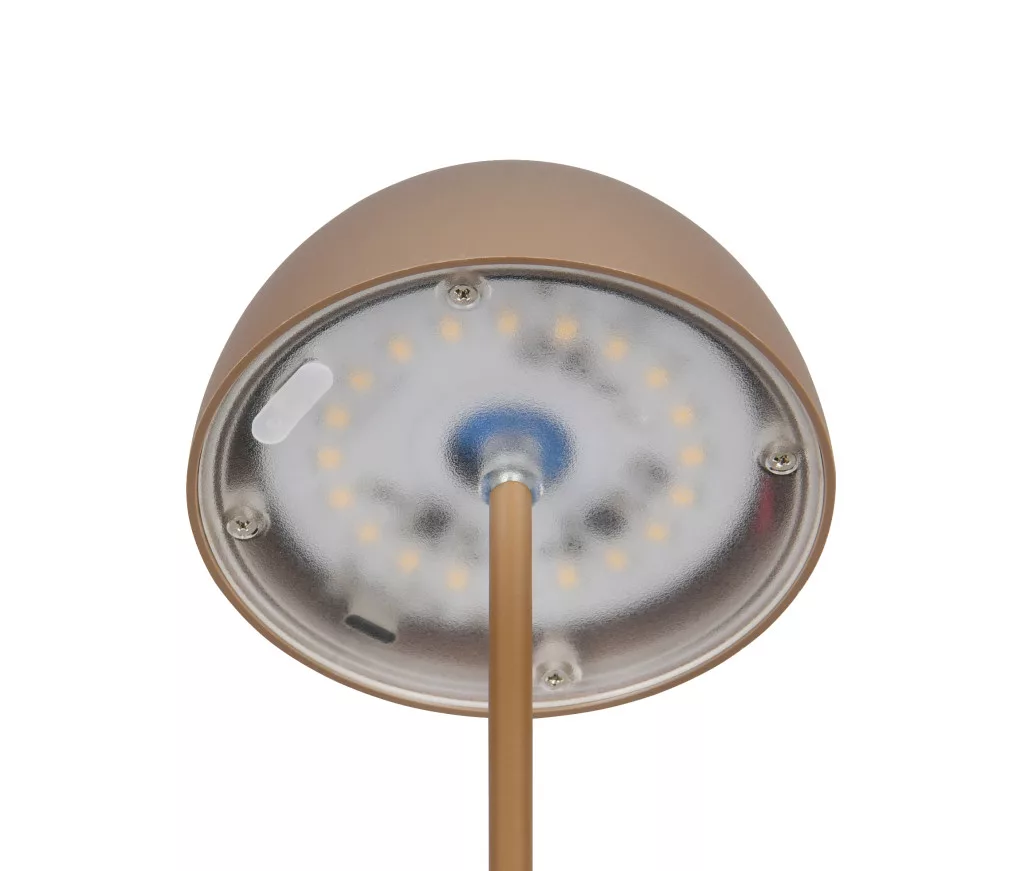 Kávé színű műanyag akkumulátoros asztali lámpa műanyag betéts búrával, felfelé és lefelé egyaránt világító meleg fehér színhőmérsékletű beépített LED fényforrással. A LED fényereje 3 lépcsőben érintéssel állítható. A lámpafejen lévő USB kimeneten keresztül tölthető. Töltési idő kb. 2 óra, amivel a lámpa akár 3 órán keresztül üzemel. A lámpa IP44-es védelemmel rendelkezik, így kültéren és beltéren egyaránt használható.