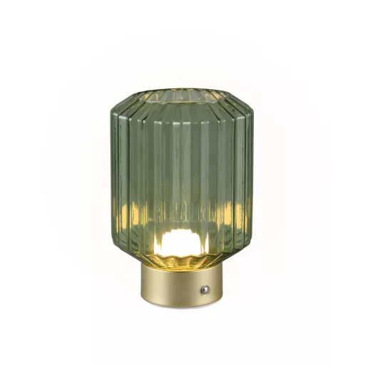 Matt sárgaréz színű fém talpas dekorációs lámpa zöld színű üveg búrával, meleg fehér színhőmérsékletű beépített LED fényforrással, érintőkapcsolós fényerőszabályzóval. A lámpa akkumulátorral üzemel, töltési idő 6-8 óra, teljes töltéssel pedig 12 órát képes a lámpa világítani.