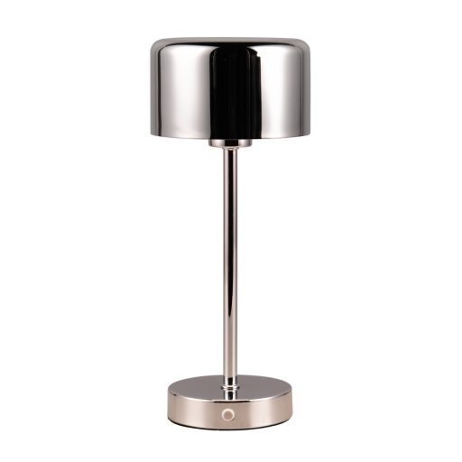 Króm színű fém dekorációs lámpa meleg fehér színhőmérsékletű beépített LED fényforrással, érintőkapcsolós fényerőszabályzóval. A lámpa akkumulátorral üzemel, töltési idő 6-8 óra, teljes töltéssel pedig 12 órát képes a lámpa világítani.