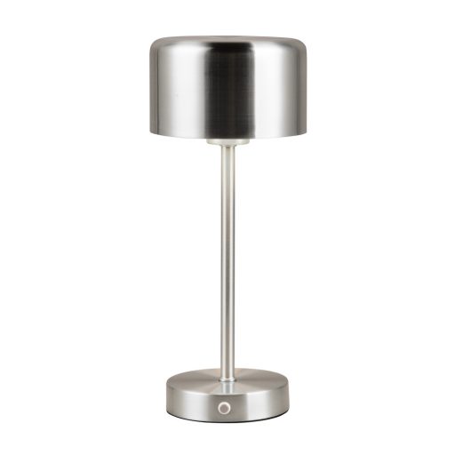 Matt nikkel színű fém dekorációs lámpa meleg fehér színhőmérsékletű beépített LED fényforrással, érintőkapcsolós fényerőszabályzóval. A lámpa akkumulátorral üzemel, töltési idő 6-8 óra, teljes töltéssel pedig 12 órát képes a lámpa világítani.