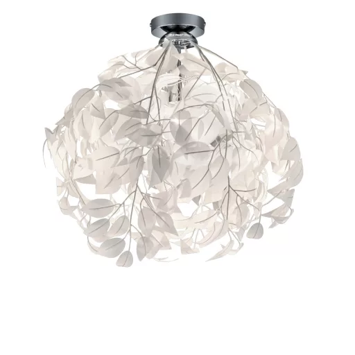 Króm színű fém vázas mennyezeti lámpa fehér színű műanyag, levél dekoros búrával, 1db E27-es foglalattal.
