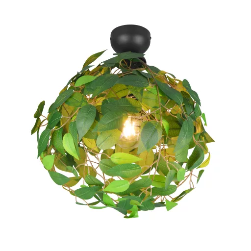 Fekete színű fém vázas mennyezeti lámpa 38cm átmérőjű, zöld színű műanyag, levél dekoros búrával, 1db E27-es foglalattal.