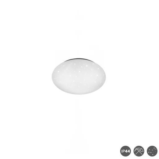 Műanyagból készült mennyezeti lámpa fehér színű csillagos égbolt effektes búrával, beépített természetes fehér színhőmérsékletű LED fényforrással, IP44-es védelemmel.