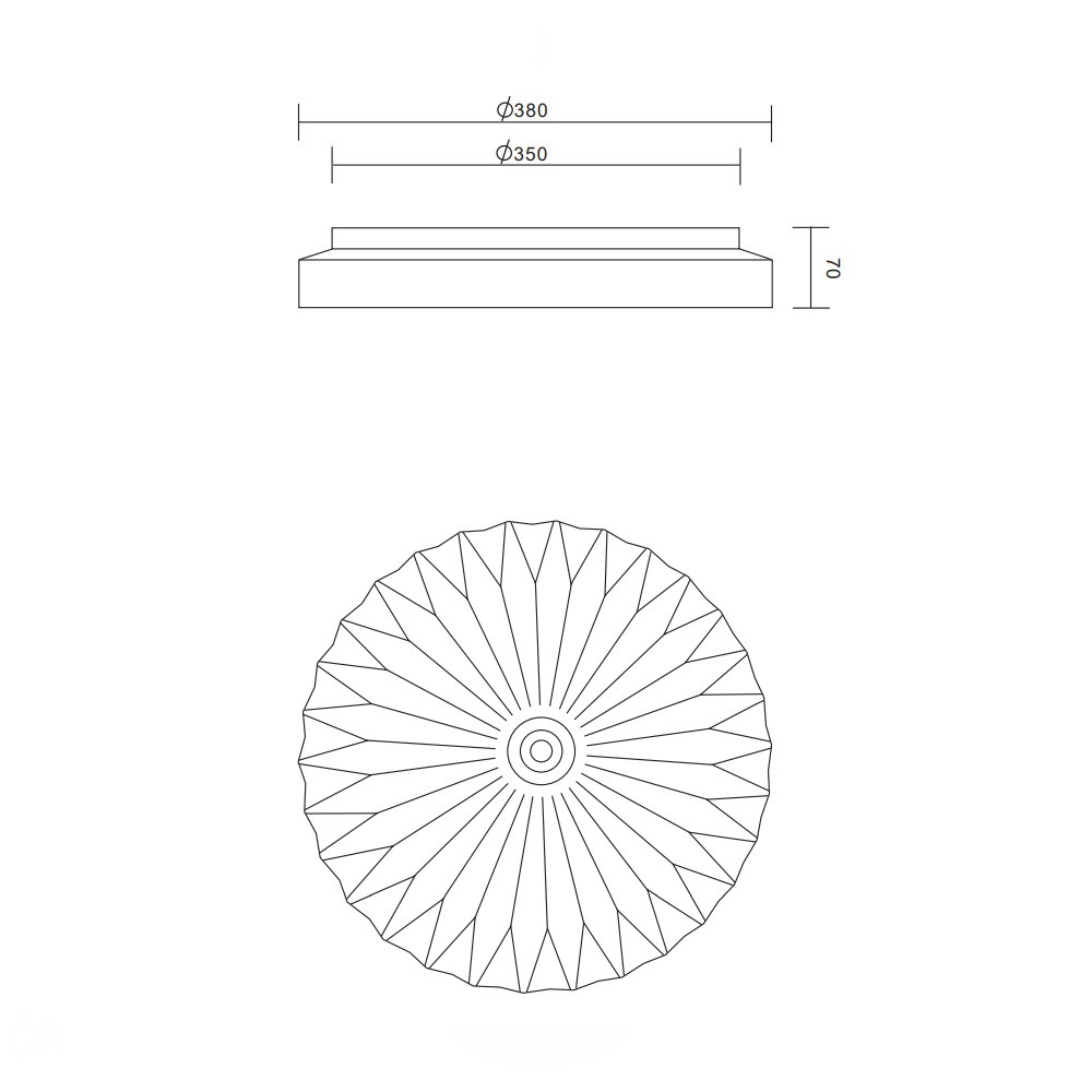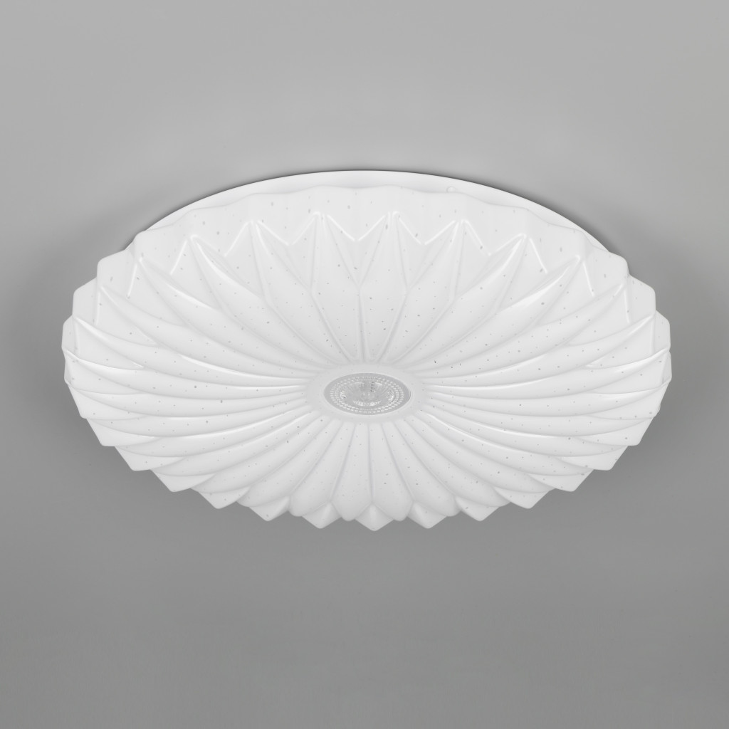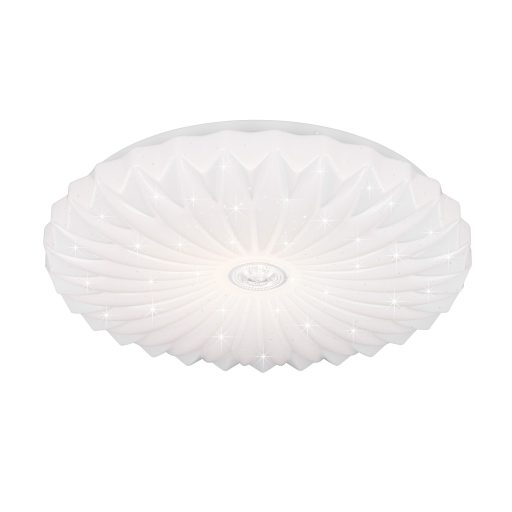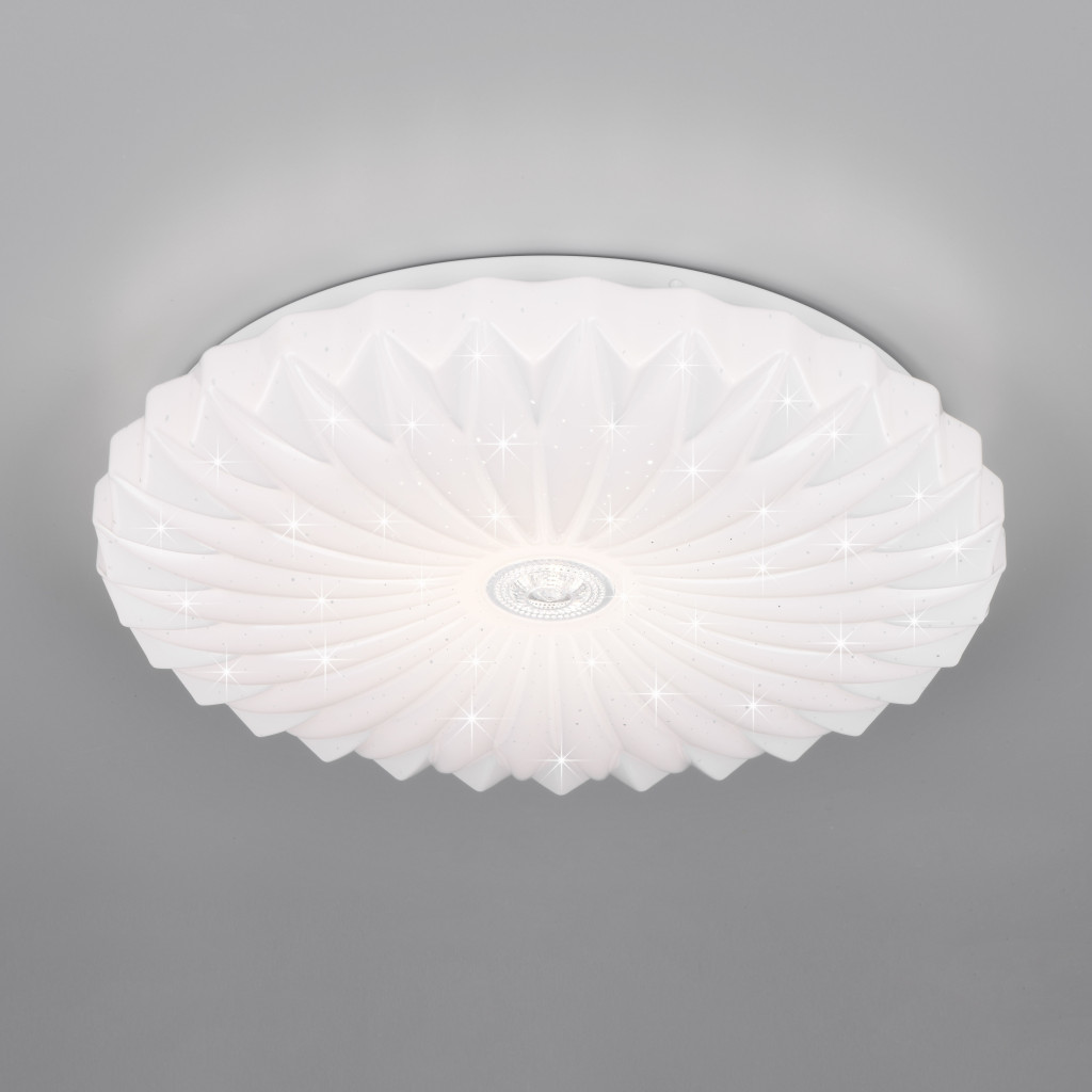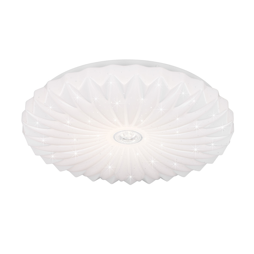 Matt fehér színű műanyag mennyezeti lámpa dekoratív, csillagos égbolt effektes, fodrozott búrával, beépített LED fényforrással. A lámpa fényereje hagyományos fali kapcsoló többszöri fel-le kapcsolásával is állítható 25/50/100%-ra. Illetve a lámpához távirányító tartozik, amivel állítható a lámpa fényereje, illetve a színhőmérséklete 2700-6000K között, azaz melegtől a hideg fehér tartományig. A lámpa továbbá memória funkcióval is rendelkezik.
