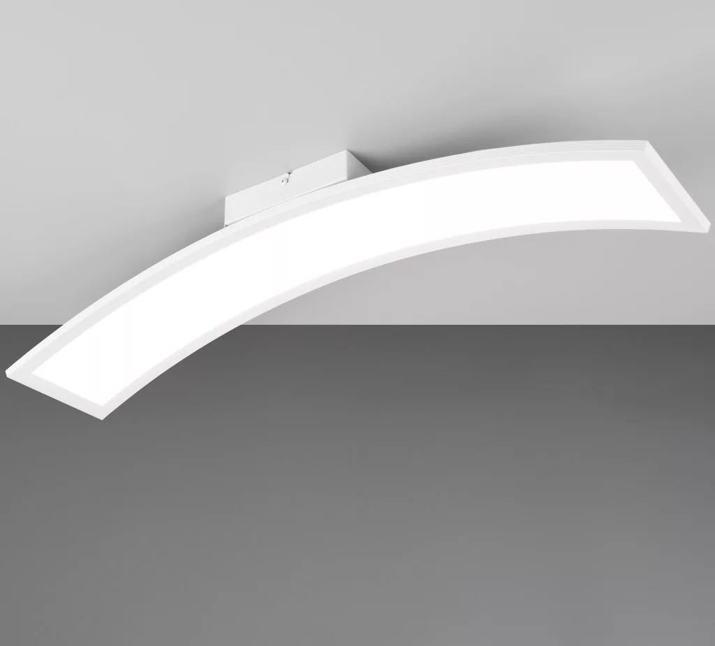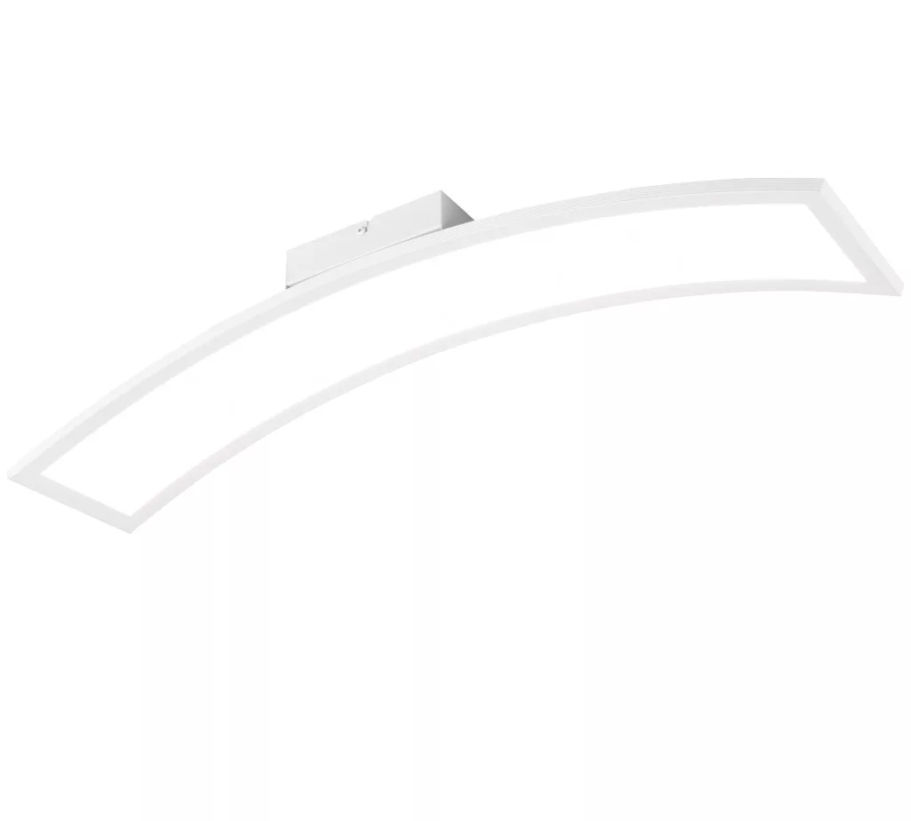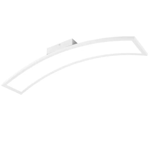 Fehér színű fém vázas, fehér, íves műanyag búrás mennyezeti lámpa, beépített, meleg fehér színhőmérsékletű LED fényforrással.