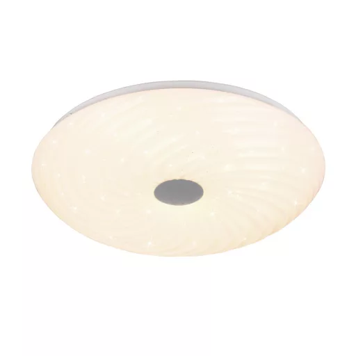 37,5cm átmérőjű, fehér színű műanyag mennyezeti lámpa, kölönleges csavart, csillagos égbolt effektes búrával, beépített LED fényforrással. A lámpához távirányító tartozik mely segítségével állítható a LED fényereje és színhőmérséklete(2700-6500K között).