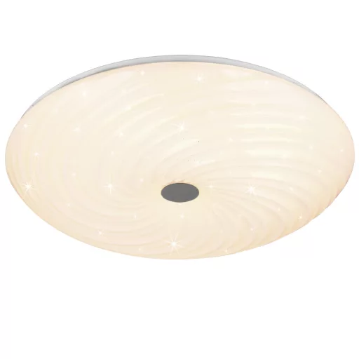 57,5cm átmérőjű, fehér színű műanyag mennyezeti lámpa, kölönleges csavart, csillagos égbolt effektes búrával, beépített LED fényforrással. A lámpához távirányító tartozik mely segítségével állítható a LED fényereje és színhőmérséklete(2700-6500K között).